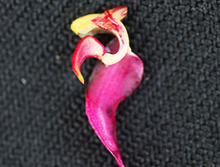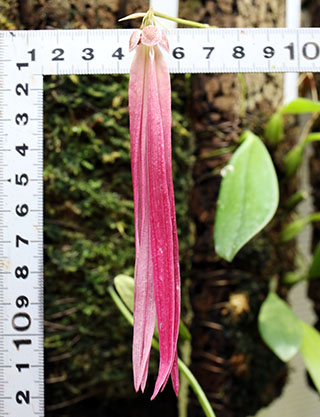 Bulbophyllum bandishii バルボフィラムの中で最も高額種の一つ、ニューギニアIrian Jaya低地生息のBulb. bandishiiが開花しています。生息国インドネシアのラン園Foresta Orchidsでの昨年末の価格は1バルブ当たりUS$25とされていました。当サイトでは現在3株栽培しており、それぞれ1株6バルブからなる野生栽培株です。orchidspecies.comでは花サイズが1㎝(幅) x 5㎝(高さ)とされていますが、当サイトの花はNS(自然体でのサイズ)で4㎝(幅) x 12.5㎝(高さ)の倍以上の大きさであることから、本種の花サイズについて誤解のないよう本日(19日)写真に収めることにしました。