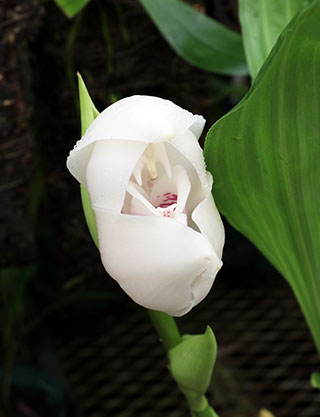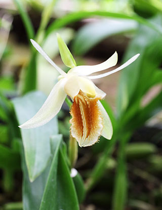 Coelogne celebensisの色変化 Coel. celebensisはスラウェシ島標高1,000m以下に生息し、花サイズは10㎝を超える大型のセロジネです。現在10株ほど栽培しており、通年でいずれかの株が開花しています。本種の特徴はリップ色が開花時から枯れるまでの間に大きく変化することです。通常開花時では、リップ中央弁の色は橙色(だいだい色)ですが、やがて赤褐色へと変化していきます。今回撮影した花は、開花直後のまだ完全に開ききっていない時の色が、下写真左に見られるように赤味の強いニンジン色(19日撮影)で、やがて中央写真の赤褐色(23日撮影)へと4日程で変化しました。左と中央の画像は別花のように見えますが、同じ花です。株の中には黒色に近い暗褐色に変化する花も見られます。短い期間内に起こるこうした現象は、花に含まれるアントシアニン色素の変化とされますが、その変化が植込み材のピンク系によくみられるpHや、青系にみられる温度によるものとは、このセロジネに関しては環境が異なっていても同じ生態であることから考えにくく、では開花後の光によるものか、次回開花直前に花に遮光して、色合いを比較しようと思います。右写真はCoel. celebensisの株で花茎は50㎝程伸長し、1輪つづ開花を続けます。バルブの充実した株では葉幅が25㎝ほどにもなります。プラスチック・スリット入り深鉢にクリプトモスの植付けです。花茎は花が付くとその重みで弓なりに下垂するためベンチ置きは適さず、花茎の発生時にポットごとバスケットに乗せ、吊るしています。ところで現在当サイトのトップページメニュー”その他原種”のセロジネは6種のみの掲載ですが、現在進めている改版ページでは40種の増版となります。
