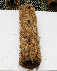 下写真1はヤシ繊維マットを巻いた円筒を上写真4のミズゴケ面に、より均一に密着させるため、押さえ付けながら防鳥ネットを巻きつけていき、巻き終わったならば2のようにバラケないようクリップで数か所を仮留します。その後、1mm径のアルミ線を全体に巻いて固定したものが3となります。4は手前の筒がミズゴケの取り付けが終わった数個の円筒です。