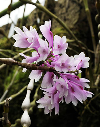 3月から4月は多くのランが開花し、また新芽や新根の発生も盛んで植替えの適期となります。当サイトでは栽培する属種が多く、全てのランを適期に合わせて植替える余裕がなく、年中植替えを行っているものの、それでもこの時期は植替え作業に一層追われます。そうした中で最近は植付け方法の新しい試みを盛んに進めています。その背景にあるのは当サイトでの栽培種の中心が、人工的に改良された交配種ではなく原種であることから、花のみの観賞だけでなく、属種の生態(自然体の姿)にも興味があるからです。栽培を初めた頃は定石通り、素焼き鉢にミズゴケの組み合わせでした。しかし、ラン生息地でのラン園や趣味家宅を頻繁に訪問することで認識を新たにしたのは、彼らの栽培ではベンチ(鉢を置くテーブル)上で栽培されているランは地生ランとフラスコ苗あるいは台湾等から輸入された交配種だけで、着生ラン原種は例外が無い程、吊り下げられた取付材、バスケットあるいは庭木などに植付けられている光景でした。彼らに聞くと、原種は花、花軸、葉、茎、根など全ての調和が美しいとのことで、国内で見られるような、地生、着生に関わらず、殆どのランは素焼き鉢にミズゴケか、プラスチック鉢にバークでの植込みで、株が大きくなると支持棒を何本も鉢に立てて株を直立させた姿、これは限られた栽培スペース上の制約から止むを得ないことでもありますが、とは違っていました。花のみの色合いや形を楽しむのか、花の開花した自然体の株姿を楽しむのかと、少々哲学的ですが考えさせられ、それ以来、当サイトでも着生ランの栽培は吊り下げ栽培が中心となりました。これが12年ほど前のことです。現在(14日)開花中の花