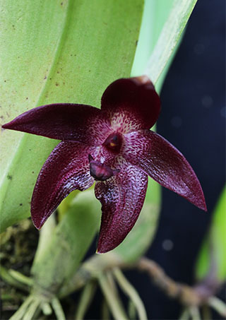 2016年と2017年にボルネオ島生息の葉幅の広いCleisocentronを入手し、種名不詳種として栽培・販売をしてきましたが、生息標高情報が無いことからClctn, gokusingiiと同じ中温室にて当初は素焼き鉢にミズゴケ、1昨年から炭化コルクで栽培を続けてきました。入手から4年経過し今週やっと初花が得られました。現在10株程を栽培していますが、ようやく本種の栽培法が分かるようになり、1昨年あたりから成長が見られるようになっています。Clctn. abasiiも10株ほど栽培しており、こちらも現在成長が活発で年内の開花を期待しているところです。| Clctn. sp wide leaf | ||