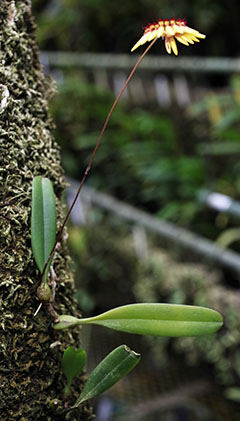 昨日(8日)、ラベル名Bulb. ocellatumの中に、これまでに見られない花が咲いていました。こげ茶色したペタルが特徴のBulb. ocellatumは、Aurea州低地生息のフィリピン固有種とされる2011年登録の新種です。この種は成長が盛んで、当サイトではそのほとんどがクラスター株となっており、バルブ数10個を1株として換算すると、百株を超える株数となります。こうした中、5年以上前に植付けた株にBulb. ocellatumと比べ一回り小さいものの、黄色が鮮やかな花が開花していることが分かり撮影しました。Bulb. ocellatum complex (近縁種)は早朝全開し、午後からは閉じる特性があり、これまで何度か開花していたようですが気が付きませんでした。写真上段は今回開花したその花(以下、Bulb. sp aff. ocellatumとします)です。| Bulb. sp aff. ocellatum | ||