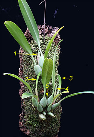 Bulbophyllum recurvilabreに見る成長 今年4月に、ブロックバークに植替えたBulb. recurvilabreのその後を7月の歳月記で紹介しました。それからさらに3か月が経ち、再び株の成長具合を撮影しました。下写真の上段左と中央は植替えた株とは別株ですが現在開花中のBulb. recurvilabreです。一本の花軸に5輪の開花は珍しいことから撮影しました。上段写真右は4月植替え直後の株の様子です。下段左は植替えから3か月間経過後の新芽を示したものです。これら新芽にはまだバルブが形成されておらず、芽の伸長過程にあります。写真中央は昨日3日の撮影で、番号を付けた新芽1-4はバルブが形成されています。一方、番号5は数ミリの発芽直後の芽でしたが、こちらは枯れました。その代わりに隣接するバルブから新たな芽(new)が発生しています。右写真は3と4番目の基部が中央写真では見にくいため、角度を換えての撮影です。このペースで成長すれば、植替えから1年となる来年4月頃には5つの新バルブも充実し、それらに新たな芽が発生すると思われます。