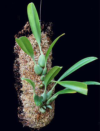 初開花のBulbophyllum sp 2018年マレーシアPutrajaya花展でBulb.spとして入手したパプアニューギニア生息とされるバルボフィラムが、栽培開始から3年を経て、ようやく開花しました。始めて見る花で種名は不明です。ネットで調べたところ該当種は2018年3月のOrchid Forum に "Bulbophyllum sp. Papua"として花画像がある以外、他には見当たりません。入手から3年が経過しており、すでに登録済みかも知れません。開花までに3年を要したのは、中温室において2年間栽培を続けたものの開花がなく、昨年末に高温室の比較的輝度の高い場所への移動と最近の植替えによるものです。この栽培環境の変更は、2018年Putrajayaで入手したパプアニューギニアからの種名不詳種として今年4月の歳月記で取り上げたケースと同じで、花色やサイズは異なるもののリップ形状は似ており、いずれもPolymeres節Bulb. quadrangulareの近縁種と思います。本種の花サイズは5 - 6㎝で、早朝に開花し昼前には花を閉じることから、雲霧林生息種と推定しています。本種の詳細は改版したトップページバルボフィラム・メニューにsp32として追加しました。
