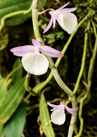 ここ3日程は晴天が続き、寒冷紗を開けた浜松の高温室の中は昼間34℃まで上昇します。夜間は昼間の残温で20℃を僅かに下がる程度です。こうした中、開花中の9種を選んでみました。Bulb. klabatenseは標高から中温とされますが、当サイトでは中温室に2株、高温室に5株を栽培し、この時期高温室の本種5株が全て開花中です。中温室は夏期の開花となります。Bulb. chryglossumは、当サイトではこれまでBulb. denophyllumとしてきましたが、ジャーナルにこの名前と写真があったので、chryglossumとしました。しかし情報が少なく種名は暫定名となります。Phal. schilllerianaは現在40株ほど栽培しており、間もなく最花期を迎えます。写真は先頭を切って開花した本日(11日)撮影の1株です。Aerides leeanaはSamar島からの野生栽培株38株を栽培しており、その内35株が花茎をつけました。先月末から開花が始まり今月末まで続きます。これからPhal. amabilis等胡蝶蘭やDen. anosmumなど多輪花系の原種の開花期となります。青い種名のクリックで詳細情報にリンクします。