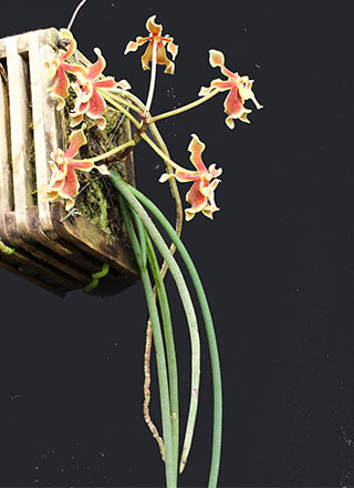 Phal. schillerianaが現在最花期となっており、栽培している40株程の7割で開花中です。Paraphal. labukensisは5株を炭化コルクに、7株をバスケット植えで栽培しており、現在開花中の株はバスケット植えの4株です。本種は根が常に湿っていることが必要でバスケット植え(斜め吊り)がより成長が良いようです。Den. anosmumの花サイズは左右のペタル間スパン(幅)は一般種で10㎝(平均7㎝)までですが、superbumとされる花サイズは10㎝以上となり、またそのサイズは株の状態や環境に影響されないことから、Den. anosmumとは別種と云うよりは変種と考えています。Den. aurantiflammeumは3月から6月頃が主な開花期となります。画像下の青い種名のクリックで詳細情報にリンクします。