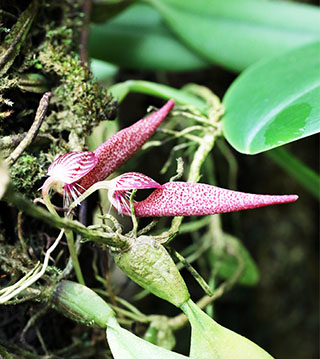 また多くのネット上でのDraculaの花画像は殆どが左写真のような顔の部分だけで、花全体を撮影した姿は少なく、これはDorsalおよびLateralセパルの先端部から伸びた線状突起が長く、花全体を画像に入れると顔部分が小さくなり顔の特徴が見にくくなるためです。この線状突起を含めて表示した画像が下右写真で、Dracula chiropteraはDracula vampiraに次ぐ大型種ですが花サイズは22㎝程となります。