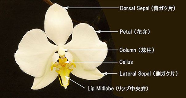 | 胡蝶蘭Phal. amabilisの花の構成要素と名称 |