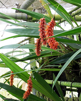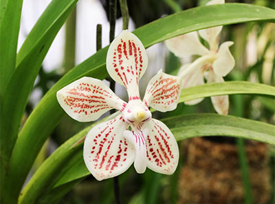 現在(5日)スラウエシ島生息のVanda jennaeが開花中です。本種は2005年登録の新種で、ISOPEによると生息標高域は1,200m周辺とされます。こうした情報から本サイトでは2014年の入手からDen. papilio等と同じ中温室にての栽培としました。しかし2014年7月の初花以来、開花は1-2度で株の成長も遅く、1昨年に1株を高温室に移動したところ、先月末に開花となりました。高温室での成長・開花が見られたことから入荷株は1,000m以下での生息と思われます。またこの時期の開花は1日の昼夜の温度差が10℃以上となることから、当サイトのページは生息域を600m - 1,200mと推定し、今後は夏期の猛暑期には中温室に移動させ、他期は高温室にて栽培にすることにしました。今回の開花は2輪ですが、本種の花軸当たりの輪花数は5-8輪とされており、下画像よりも大きな株が2株あることから次期開花期にはそれなりの輪花数が得られると思います。画像下の青色種名のクリックで詳細情報が得られます。