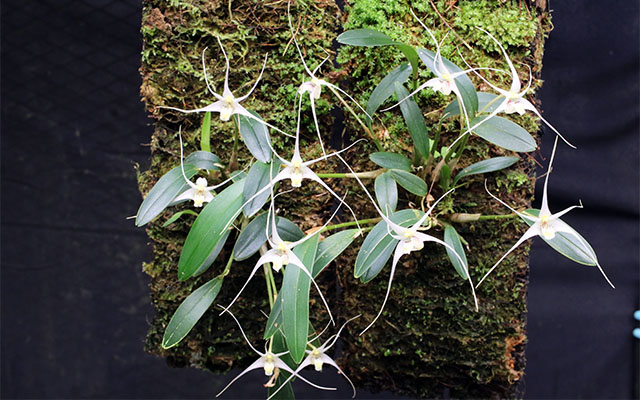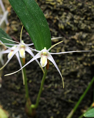 Coel. palawanensisが現在(16日)開花しています。本種はパラワン島に生息するフィリピン固有種で、当サイトでは2017年11月にパラワンから入手しました。なぜかJ. Cootes著 Philippine Native Orchid Species, 2011には本種の記載が無く、またIOSPEでは花サイズが2.5㎝の小さな花とされ、実体(6㎝ x 5.7cm )とは甚だしく異なります。さらにグーグルでマーケット情報を検索しても、花画像はOrchidroots.comを始め、幾つかのfacebookに見られる一方で、販売情報は国内外を含め当サイト以外には無いようです。すなわち本種は純白で気品のあるセパル・ペタルが際立った幻の如き存在です。