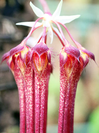 一方、Bulb. orthoglossumは、通常ラテラルセパルは無地か、赤色のラインが薄く入りますが、今回の開花種には明瞭なラインが見られたので撮影しました。Den. miyasakiiはデンドロビウムとしては稀な、木には着性せず生息様態は岩性および地生とされます。当サイトでも本種にはミズゴケではなくパフィオペディラムと同じコンポストで植付けています。それぞれの詳細情報は画像下の青色種名のクリックで見られます。