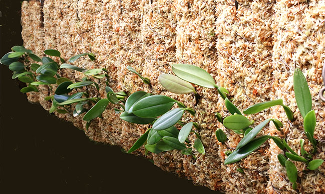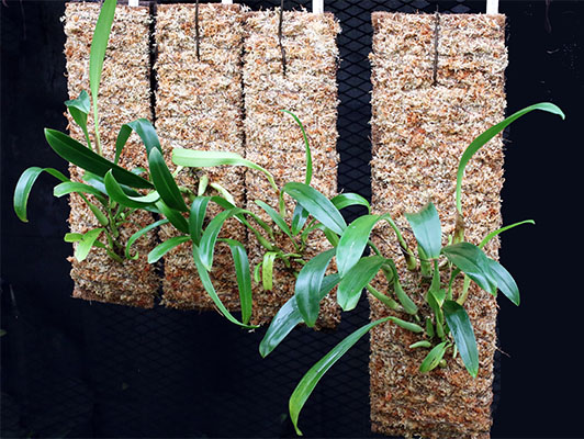 今回、販売向けとして本種も植替えを行うことにしました。支持材は25mm厚の炭化コルクがペース(30mmは現在入手不可)となっています。一方、吊り下げ栽培において25mm厚の炭化コルクでは長さ50㎝を超えると、耐久力は2年が限度(自重による崩れ)となり、また反りも生じることから、これらを防ぐ金具を支持材の長さに応じて取付け、さらにコルク上下部の乾湿差を抑えるために保水性のあるヤシ繊維マットとの組み合わせとしています。