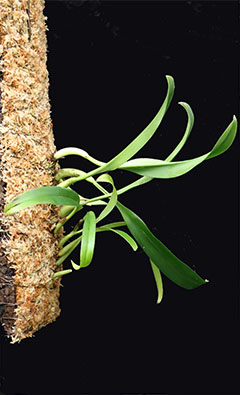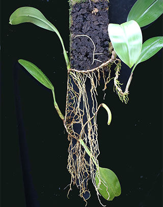 2022年9月撮影の本種で、上中央の株が1年程の間に急速に成長したことが分かります。入荷時から2021年までの5年間の成長と、2021年から今日に至る成長度合はかなり異なり、この背景に適温下で根を常に湿った(濡れとは異なる)状態と、比較的高輝度下での栽培に依ることが大きいと考えられる一方で、一度根の傷んだ2-3葉バルブ株を回復させ成長軌道に乗せることの難しさ(長い年月を要す)も見て取れます。右は今回の販売に向けて、左写真の株の一部を1株15葉以上のバルブ数に株分けし、炭化コルク+ヤシ繊維マットに植付けたものです。右写真手前の株は17葉です。
