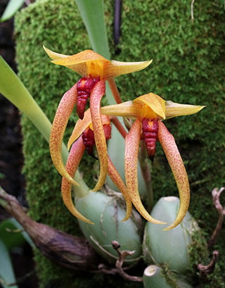 一方、中央画像は植替え前のBulb. callichromaで、左側が60㎝炭化コルク、右側が50㎝ブロックバークです。そのいずれの株も先端部が20㎝以上飛び出し、活着面がないため支持材トップから折り返して(ぶら下がった状態で)伸長しています。右画像は60㎝支持材4個にこれら2株を株分けして植替えを行ったものです。支持材の伸びしろを20㎝程取っていますが2年ほどで再び超えると思います。Bulb. callichromaも中央画像と同じようなサイズの株をさらに8株栽培しており、今月末までに全株の植替えを終える予定です。これら2種の花画像は画像下の青色種名のクリックで見られます。