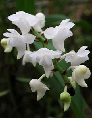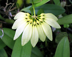 下画像のバルボフィラム3種が栽培されている高温室内では、晴天日の日中の温度は35℃以上、一方デンドロビウム2種の中温室内では30℃前後となる中でのそれぞれの開花となっています。Den. klabatenseは42輪の同時開花で下画像は3日の撮影です。株の根元に小さな新芽が出ていたため今回は高温障害を恐れ、撮影後に全ての花を摘みました。高温室栽培のPaph. lowii var. albumは、20年近く前に米国Orchid Innから入手した実生(自家交配)株で、花サイズは左右のペタル間スパンで9-10㎝となります。