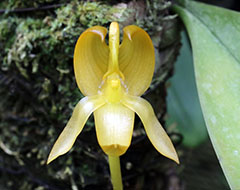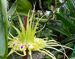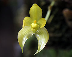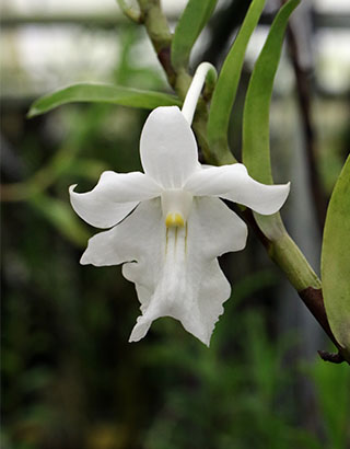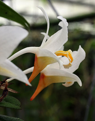 現在開花中のDendrobium serratilabium flava、Dendrobium stuposum redおよびCoelogyne bicamerataを撮影しました。フィリピン生息種のDen. serratilabiumはノコギリ状のリップ外縁形状が特徴で、その種名の由来ともなっています。当サイトでの本種の初入荷は2009年ですが、現在栽培している株は全て2019年にレイテ島生息種として入手したものです。このロットは、開花時のセパル・ペタル全体が薄黄緑単色で一般種とは大きく異なっており、また栽培を通して得た生態からはやや中温寄りで、標高が800m以上の生息種ではと推測しています。とりわけ下画像の株は緑味のあるベース色の花にしばしば見られる、セパル・ペタルの背面に残る薄い赤褐色のラインやSpur(距)に滲みは一切無く、ネット上からは他にこうしたフォームが見当たらないことと、このフォームは例年継承されていることから極めて稀な株と思われ、当サイトではflavaの付帯名をつけています。