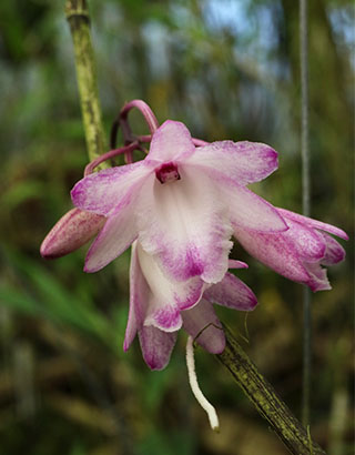 現在、Den. jiewhoei の開花期を迎えています。本種は近年発表(J.J.wood, etal. 2008)のデンドロビウムで、ボルネオ島標高1,000 - 1,500m程の生息種とされます。また2014年にはDen. calcariferum(Carr. 1935)とはシノニム(異名同種)とされ、IOSPEのDen. calcariferumとDen. jiewhoeiのサイトページには同じ花写真がコピーされています。不思議なことは、両種の生息域が重なっていることと、近年の情報化時代に於いて、なぜDen. calcariferumの発表から凡そ70年後にMalesian Orchid Journal Vol.3, 2009年に本種が新種名で掲載されたのか、現在、Den. calcariferumを検索するとDen. jiewhoeiと思われる多数の画像がネットに見られますが、そうした画像は2009年までそれぞれのメディアに掲載されることが無かったのか?よく分かりません。