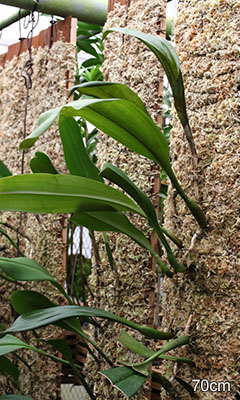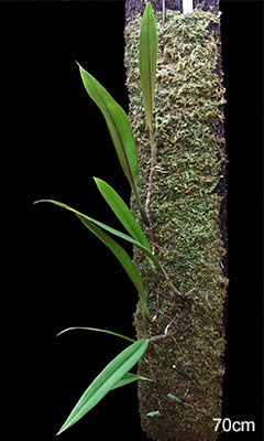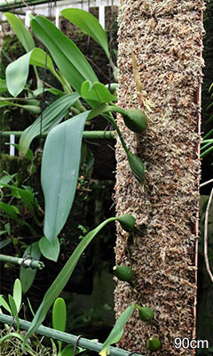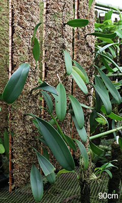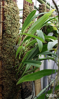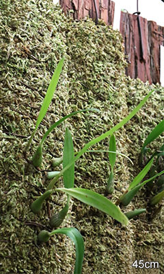 前項の16種の植替えに続いて、今回は90㎝長の杉板(1㎝厚x15㎝幅x90㎝長の杉板に杉皮を重ねた構造)に新たに植替えた3種を撮影しました。いずれも取付面積の1/2 - 1/3近くを株の伸びしろとしており、植付け直後の下画像からはずいぶん空いた面積が広いように感じますが、株が60㎝程になると成長も早く2-3年でリードバルブの葉先はこの取付材の長さを越えるほどになると思われます。下画像のそれぞれのバルボフィラムは、ネットの検索からは、いずれもマーケット情報が少なく、現在入手が難しい種のようです。