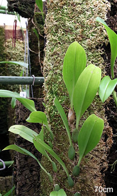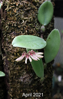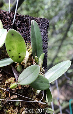 その右は炭化コルクに植付けてから3年半後の2021年4月に得た初花で、株は左の入荷時の画像に比べ生気があるものの、葉数は4葉程で植付け時から株サイズに変化はありません。画像4はその初花からさらに2年後の株で、株サイズは入荷時と比べ倍近く増えています。すなわち画像2の入荷状態から画像4に示す株サイズになるまでには6年近くが経過したことになります。