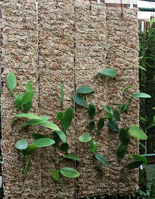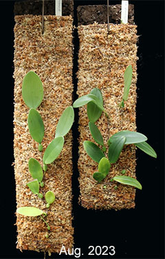 下画像左は2023年8月に上画像4の株(右側)と別の1株(左側)を新たに炭化コルクとヤシ繊維マット構成の2枚の支持材にそれぞれ植替えた時の撮影です。右の4輪の花姿は、画像5の植替えから1年半後の2025年1月の開花です。また画像7は今年9月に画像5のその後を撮影した株姿で、この2株をそれぞれ2分割し4枚の90㎝杉板に植替えたのが右画像で現在の姿となります。この広い伸びしろのある支持材であっても今後2年程で覆われると思います。