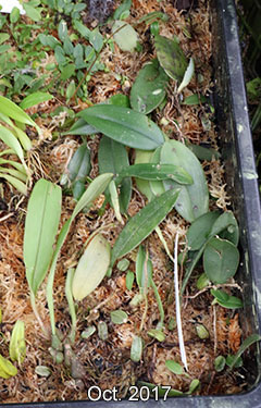 下画像1は2017年10月マレーシア現地において撮影したもので、Bulb. venulosumがヘゴ板に2-3株寄せ植え栽培されている株姿の一部です。その右画像はそうした株をヘゴ板から取り外し、国内に持ち帰ってトレーに並べた植付け前の様子です。1株当たりの葉付きバルブは多くが3-4個、5個も1株ありました。