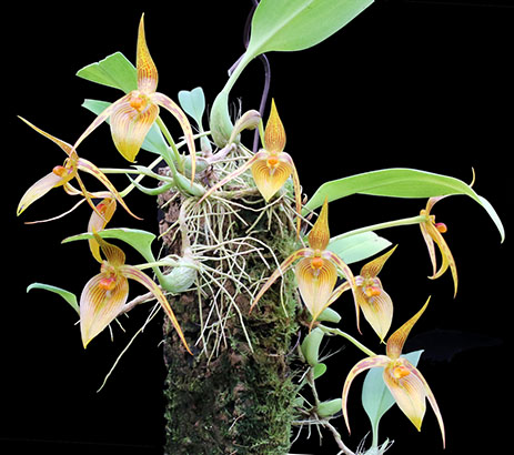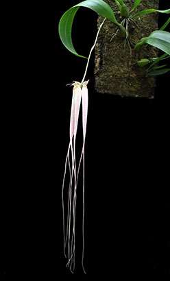 Bulb. fascinatorはインド、タイからボルネオ島、フィリピンまで広く分布する生息種(標高1,000m以下)で、その長いラテラルセパルで知られています。IOSPEによれば花サイズ(ドーサルセパルからラテラルセパル先端間)は15cmー20cmとされます。今回取り上げた株は、おそらくこの種としては最も長いラテラルセパルをもつタイプではないかと思います。画像に示すように花の全長は36cm、ラテラルセパルの長さは34cmとなります。現在当サイトが栽培する本株は葉付きバルブ数が21個あり、開花後には4株ほどにそれぞれ株分けする予定です。(後記:本種はBulb. fascinatorとlongissimumとの交雑種の可能性有り)![]() |