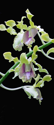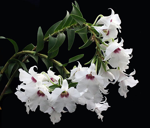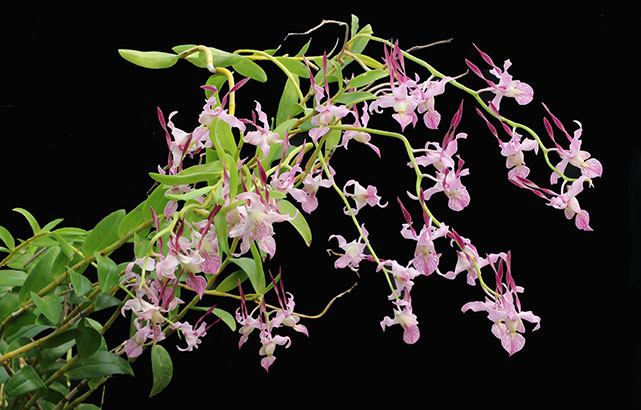 ネット上では多数の花茎を束ねて撮影された煩雑な画像も多く、花茎1本当たりの輪花数を確認することは困難ですが、そうした画像からの目算では20輪を大きく超える画像(花序)は見当たりません。当サイトではこれまで40種程のSpatulata節デンドロビウム(種名は2015年4月の歳月記に記載)を栽培してきましたが、葉元から発生する総状花序形態の花茎に50輪程が同時開花した種は見たことがありません。