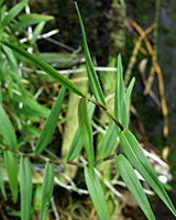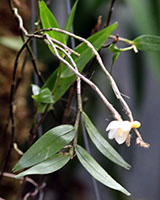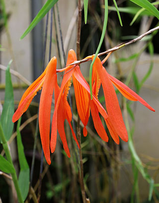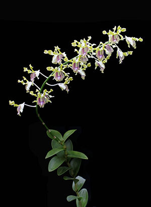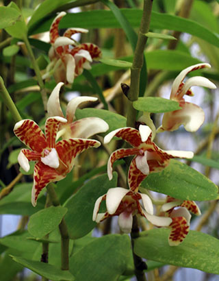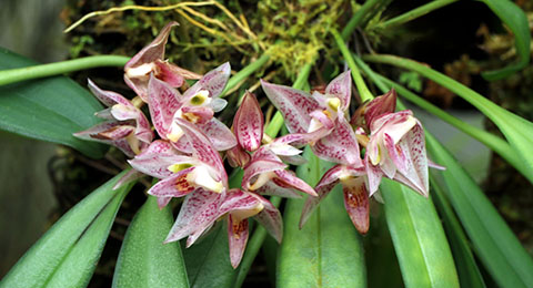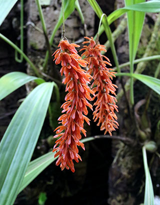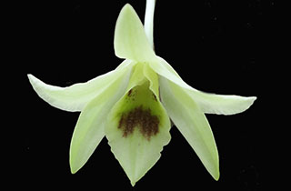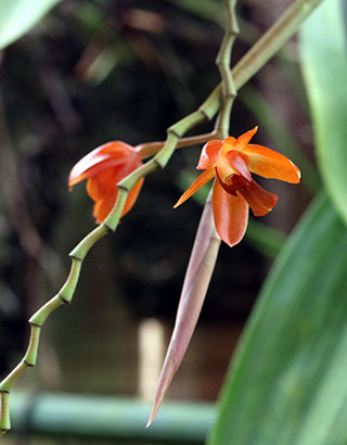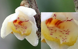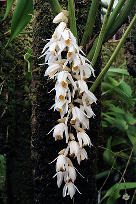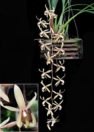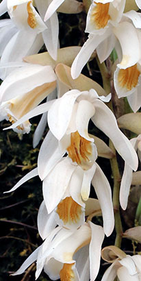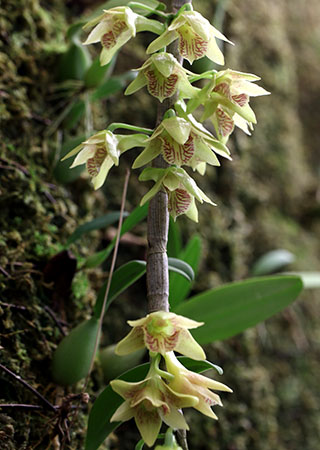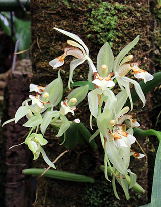 Coel. assamicaはバルブ間(リゾーム)が長いためポット植えは適さず、当サイトでは現在杉板へ取付けて栽培しています。昨年は3輪の開花でしたが今回は10輪の同時開花となりました。一方Coel. longirachisは、花は小型ですが花の終わった花軸の長いジグザグ状の節が画像に見られるように、Coel. usitanaと同様に次々と開花が続き、年中花が見られます。本種は夏期と冬期で花色が変化する特性が有り冬期は赤味が増します。