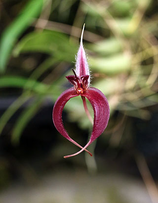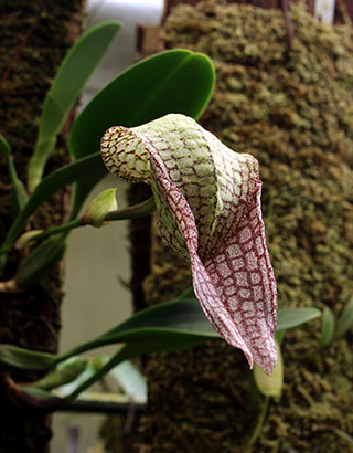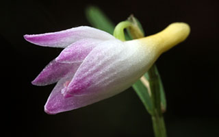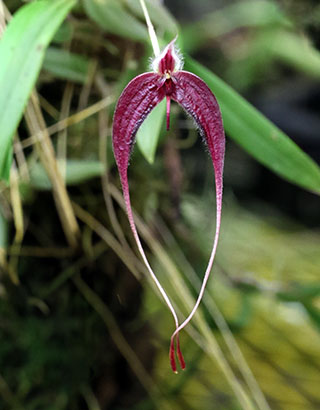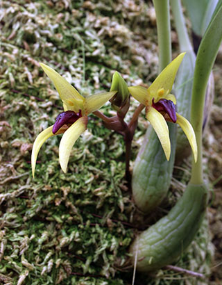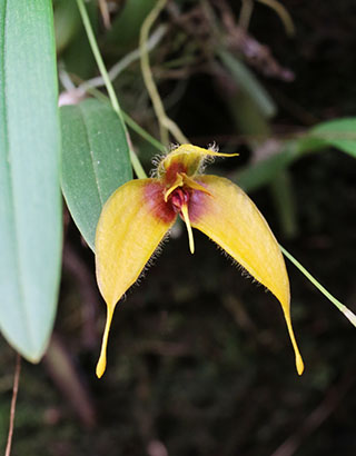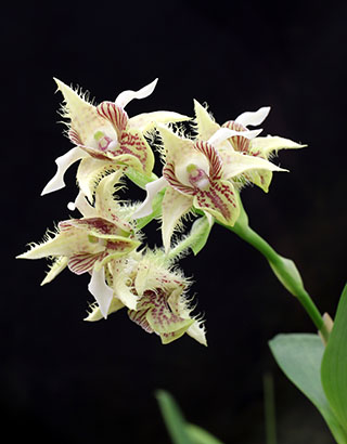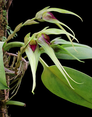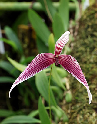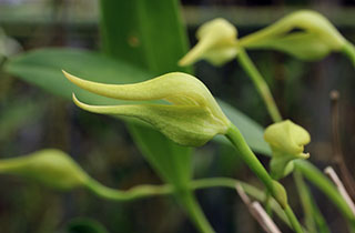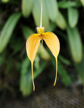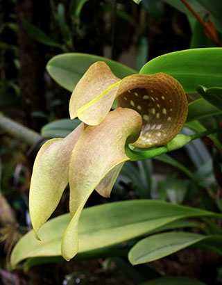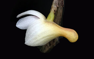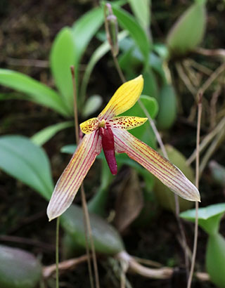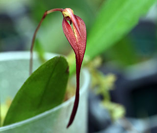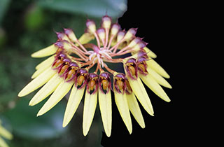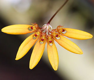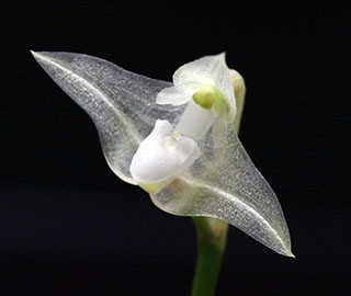 Hyalosema節と見られるバルボフィラムです。本種については一見、Bulb. arfakianumやfraudulentumのalbaあるいはflavaフォームのようですが形状を詳細に比較すると相違のあることが分かります。またキャメロンハイランドのラン園からの入手のためマレー半島やボルネオ島などの生息種を推測されがちですが、このラン園はニューギニア生息種も多数栽培しており、本種の形状からはニューギニア生息種の可能性が高いと思われます。現在も種名が不詳であり、当サイトでは現時点では未登録種と考え、バルボフィラム・サムネイルにsp14として詳細情報を掲載(青色種名のクリック先)しています。