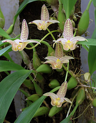 画像中央のBulb. polyflorumは2016年に記録された新種です。バルボフィラムの中で最も入手難な種の一つです。この入手難とは生息数が少ないという意味ではなく、現地から入荷する種の十中八九はミスラベルであったことからです。生息数は不明です。この経緯は 2017年6月の歳月記に報告しています。