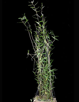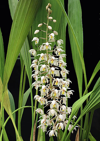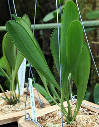 一方、右はボルネオ島標高800m以上に生息のCoel. rhabdobulbonです。本種はBSサイズになると葉サイズが大きく伸張し、葉身と葉柄を含めると60cm以上にもなります。これに30cmほどの細長い円柱状のバブルサイズが加わると株は1m近くになります。Coel. rhabdobulbonの問題は同時開花時の花数の情報に関するものです。これはDen. busuangenseについても同様です。