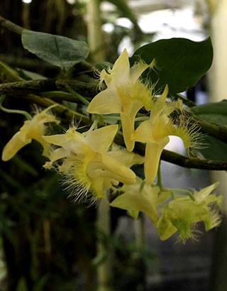 2024年の猛暑でダメージを受けたBulb. inacootesiaeはかなり回復しており、今年は20株程の内、4割ほどで開花が始まりました。Coel. sp aff. tomentosaはリップ中央弁の先端部の形状がCoel tomentosaとは異なることからsp aff.としていますが現在も種名は不明です。その形状の相違は画像下の青色種名のリンク先で見られます。Den. leporinumはこれで1株での開花です。自然体では1mにもなる疑似バルブ(茎)が広がって全体を撮影することが難しく、茎を寄せての撮影となりました。これでも画角内に入りきれない花が10輪ほどあります。本種は花寿命が長く、こうした風景が1ヶ月以上見られます。