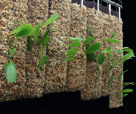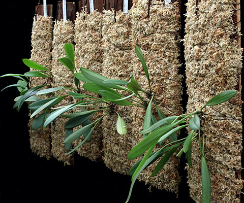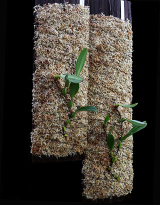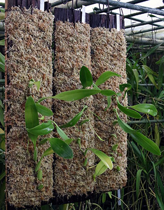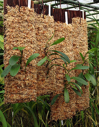 ニューギニア低地生息のBulb. infundibuliformeとBulb. obovatifolliumの杉無垢材への植え替えを行いました。下左画像の右から4株がBulb. infundibuliformeで、奥の2株はBulb. irianaeです。Bulb. infundibuliformeは画像に見られる4株とは別にチークバスケットに植付けた7株も栽培中です。右画像は全てBulb. obovatifoliumです。株サイズに合わせて支持材サイズは手前4株が40cmx15cm、右端が葉付きバルブ12個の60cmx15cmサイズとなります。