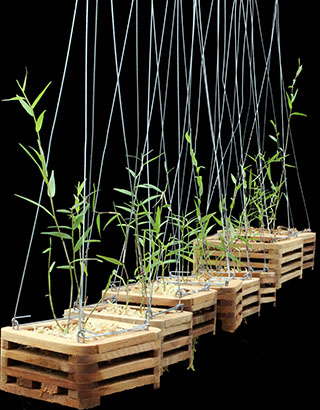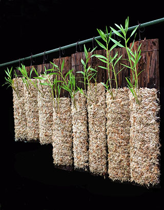 Den. Cymbulipesの類似種と思われる種名不詳の株の植え替えを行いました。本種は2017年7月にDen. cinnabarinumのミスラベルで ボルネオ島のサプライヤーから入手したもので、その経緯は同年同月の歳月記にて報告しました。下画像中央は高さ80cmの現在の株の一つで、25本を超える高芽があり今回これらを外し3-4本の高芽を1組として寄せ植えし、右画像に見られる8個のチークバスケットに植付けました。中央の画像は高芽を取り外した後の親株の姿で、まだ4-5本の高芽が残っています。