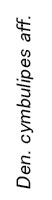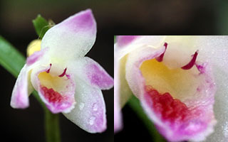 花形状から本種はデンドロビウムcrumenata節と思われます。そこでIOSPEサイトに掲載のcrumenata節84種を参照し、花形状を中心に比較検証を行いました。しかし本種に酷似あるいは該当する種は見当たりません。。一方でDen. cymbulipes名でのネット検索ではDen. cymbulipes lilac-pink sepalsとされる花の側面画像が1点あり、その形状と色合いが似ていることとその種はボルネオ島サバ州とされ生息域も本種と同じであることから、情報元のMalesian Orchid Jaurnal Vol.10 (2012) 103-122 MountTambuyukonを調べました。しかし記載から得られる情報はDen. cymbulipesの花色の違いと生息域のみでDen. cymbulipesとされることに変わりはありません。当サイトではこれまで2019年11月と2023年2月の歳月記に本種とDen. cymbulipesとの違いを報告しましたが、再度下画像に両種の相違点を取り上げてみました。画像から明らかなようにDen. cymbulipes aff.のリップ中央弁の4列の突起や葉(針形)の形状などは、Den. cymbulipesとは変種の範囲を超える相違があり、両種は別種であると共に本種は未登録のデンドロビウムの可能性が高いと思われます。