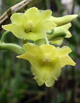本種はマレー半島、タイ、スマトラ島、ボルネオ島などの低地に分布し、下画像左に見られる個性あるリップ形状を持つデンドロビウムです。花サイズは2.5㎝程です。当サイトが本種を入手したのは2016年頃で初花は2017年5月でした。特徴は1本の元茎(疑似バルブ)から一般的に言われる高芽ではなく複数の幹枝を出し、それぞれの枝の節から発生する根を支持体に活着させながら上方に伸長していきます。現在、国内外共にネットにはマーケット情報が無いことから入手難と思い、5年ぶりに本種の植替えを行いました。画像右は長さ90㎝x幅15㎝の杉板で、すでに頂芽は支持材の上端に迫っており1年で越えると思います。多輪花の同時開花を期待しているところです。