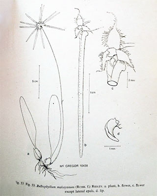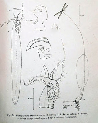 上画像の3種の相違点は蕊柱周辺の形状に見られるとの指摘もありますが、この時代の手書き図を参照して、実態とのミクロな部位の比較判別は困難です。一般的に視覚よる種名同定に用いられる主な部位は、既存類似種がもつ個体差や地域差の範疇を超える花被片(セパル・ペタルの形状や長さと幅サイズ比率)や花の開花姿勢(立性、水平、下垂性等)またリップ形状の相違による判断となりますが、上記スケッチ図から分かることは3種の中でBulb. dolichoblepharonはラテラルセパルに葉脈も見られ幅広感があり、これに対しBulb. brevibrachiatumとBulb. makoyanum は共にラテラルセパルが線形であることで、その他の部位については分かり難く、はっきりしません。