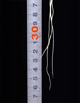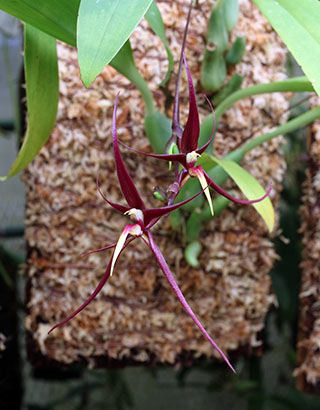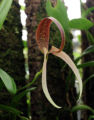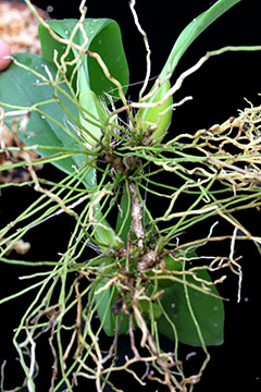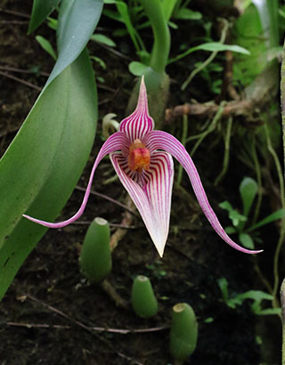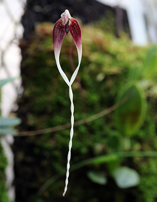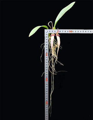 Bulb. fascinatorはインド、タイからボルネオ島、フィリピンまで広く分布する生息種(標高1,000m以下)で、その長いラテラルセパルで知られています。IOSPEによれば花サイズ(ドーサルセパルからラテラルセパル先端間)は15cmー20cmとされます。今回取り上げた株は、おそらくこの種としては最も長いラテラルセパルをもつタイプではないかと思います。画像に示すように花の全長は36cm、ラテラルセパルの長さは34cmとなります。現在当サイトが栽培する本株は葉付きバルブ数が21個あり、開花後には4株ほどにそれぞれ株分けする予定です。![]() |