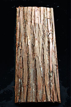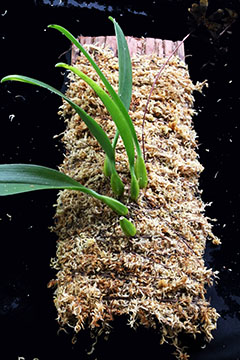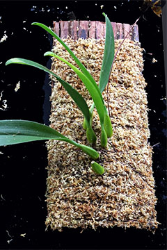 ランの植込みや取付に用いる材料は様々ですが、市場での多くは素焼き鉢やプラスチック容器となっています。当サイトもランを栽培し始めた当初は殆どが素焼き鉢でした。その後、頻繁にマレーシアやフィリピンなど海外に出かけるようになり、現地コレクターや趣味家の原種栽培には素焼き鉢の使用が全く見られず、その大半は木片やバスケットあるいはヘゴ板であることを知り、当サイトでも胡蝶蘭、バルボフィラムまた下垂タイプのデンドロビウムなど、地生ランを除く多くの原種の取付材は杉皮、炭化コルクまたチークバスケットに替えることにしました。そうした変更は単に現地の栽培手法を真似ることではなく、花、花茎、葉、バルブ等を含む株全体が織り成す、より自然な生態に近い調和の美しさ、神秘さに惹きつけられたからです。その一方で、こうした姿を維持するには、それらを取り巻く環境、とりわけ昼夜の湿度が成長と開花に大きく作用し、栽培の成否の決め手となることも学びました。| 1.Bulbophyllum mastersianm | 2.40㎝x15㎝杉板 | 3.植付け工具 | 4.左杉板にミズゴケを敷く |