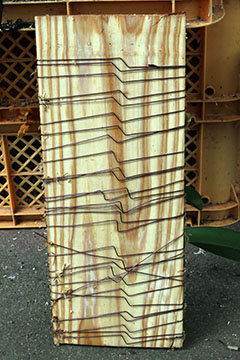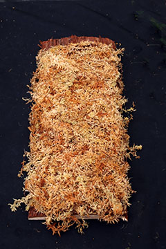 | 12.可能な限り根が接触しないように互いに離して配置した後、根の間に刻みミズゴケを挟む。上下に重なる根は多層になるようにミズゴケを挟む | 13.左記の処理後、全体を長いミズゴケで表面を薄く覆い、1mm径アルミ線を用いて株やミズゴケを固定する。右は杉板裏面で軽くアルミ線で締める | ||