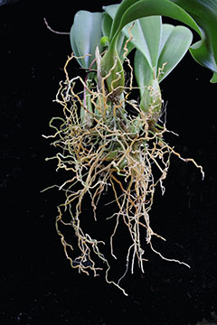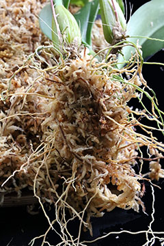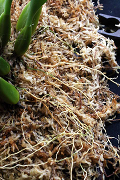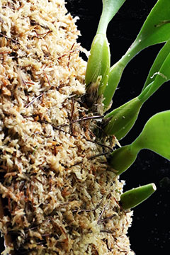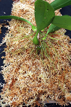 | 14.最終段階で新芽の発生の阻害防止に、それぞれのバルブ基を覆っているミズゴケを根元が見える程に取り除く。左は処理前で右は処理後 | 15.最終処理として毛羽立ったミズゴケのトリミングを行い、その後、葉やバルブに散水してミズゴケの粉末等を取り除き植替え完了となる | ||