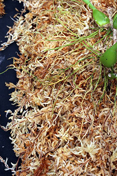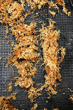 | 9.ミズゴケを丸めたもの(右)を1㎝長に切刻んだ植込み材(左) | 10.それぞれの根の接触を避けるため刻みミズゴケを根の生え際の間に挟み、これを可能な限り全ての根に対し行う(底面での根の接触防止) | 11.株を置いた後、上面での長い根は互いに重なりを避けるように配置する | |