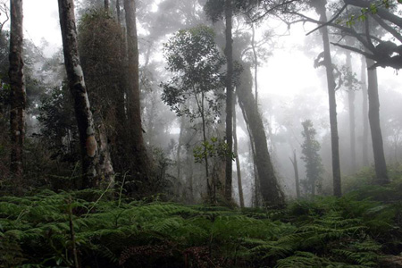 樹冠帯での胡蝶蘭の葉は全て厚く、乾燥から水分の蒸散を防ぐクチクラ層が発達しています。これはP. fimbriataやP. inscriptiosinensisなど同じ胡蝶蘭でありながら、川辺の比較的開かれた場所に生息する薄葉系とは異なります。この葉の形態は林冠層に生息する蘭が乾燥に強いことを示しています。別の視点からは、葉の厚くクチクラ層の発達した胡蝶蘭は乾燥のある環境に生息していることを物語ります。 樹冠の下に位置する中間層(Under Storey)では林冠により太陽光が遮られ、この結果、僅かな光をより多く受け取るため大きな葉をもつ植物層に代わります。この層に生息する木は2-3mの高さにしかなりません。中間層に聳える樹冠を構成する木柱には、多様な蔓が巻きつき、しばしば「絞め殺し」の木として知られるイチジク属も着生します(写真左から2枚目)。この着生植物は最初は高層の幹に着生した後、やがて根を地面に降ろし地面から水分や養分を得て根を上下に分岐させ、さらにこれらの根が互いに融合して支持木を網目状に覆い尽くし、養分を吸い上げている支持木の導管を圧迫して殺してしまうと言うものです。 低木帯 (Shrub Layer)では、主にシダ類や潅木が生息します。下位層となる林床 (Forest Floor)では、太陽光は2%程度しか到達できず、湿度も100%に近く、コケ類やシダ類が主に生息します。林床には木々の間をぬって到達する短時間の強い太陽光(陽班)を受けて育つ植物もいます。しかし林床には光が少ないため潅木類が茂るほどには育ちません。このことから熱帯雨林は、季節林と異なり欝蒼と灌木が茂るジャングルのイメージとは異なり僅かな植物で構成されています。この層に胡蝶蘭が生息しているという情報はありません。 ![]() 熱帯雨林の樹形 © Bent Christensen 一方、高地熱帯雨林から雲霧林では、湿度が高い面、着生植物の成長も旺盛であり、なかでもボルネオ島は蘭が多く、東南アジア全体で約4000種が生息する内、この島だけで1,500-2,000種が含まれます。サバ州には、その内の1,200種が、特にキナバル周辺に約800種(711種)が集中しており、その1割が固有種とされます。これ程多くの種がキナバル山周辺に集中するのは、低地熱帯雨林から雲霧林さらに植物生息限界までが広がる東南アジア最高峰4,095mの標高をもつ山林があるからです。狭いエリアであっても多様な気候環境をもつ地域は中国雲南省と同じく多種多様な生物を育みます。 標高1000m程の熱帯山地林は熱帯降雨林に比べてやや温度が低いものの常緑であり樹林の密度は熱帯降雨林ほどはなく、また林冠による遮光も少ないものの長時間の直射のない明るい湿潤な場所となります。ブナ、クスノキ、ツバキ科が林冠を形成します。 さらに高地(2,000m)に入ると、温度が下がり、通常午後からは霧も多発して多湿となり雲霧林帯となります。湿度が高いと100mで0.8C気温が下がるため、山地上部では20C以下の気温にもなります。 雲霧林では熱帯雨林で見られるほどの高木はなく、また多湿のため、低地熱帯雨林と比較して大型の着生植物や多様な苔類が多く生息しています。