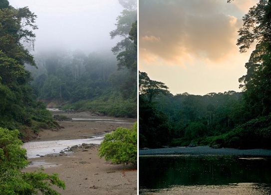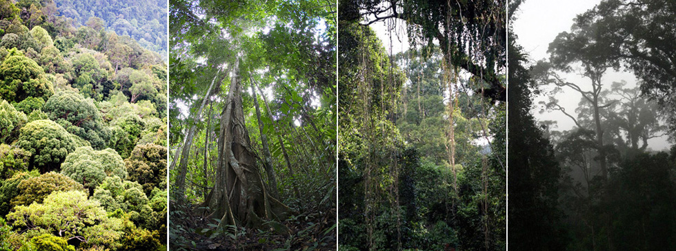 一方、内陸にはケランガス林と呼ばれる砂岩の上に有機物が堆積してできた酸性の強い土壌も見られます。ここではさらに栄養分が少なく、樹冠は10-30mしか伸びず、それぞれがほぼ同じ高さの主に針葉樹で構成されています。土壌や菌類からの栄養分に頼らない食虫植物のウツボカズラなどが多く見られます。ボルネオ島ナバワンのヒース林などが相当します。このような地域での胡蝶蘭の生息情報はありません。 さらに内陸に入った丘陵地帯の低地熱帯雨林においても落葉などの堆積による栄養分は少なく、板状に張った板根が大きく発達した樹木帯となります。ここでは高温多湿であるため落葉等の有機物の堆積よりも分解速度の方が早く、これらによる栄養分の蓄積ができません。しかし堆積物が少ない林床であるにもかかわらず、この地帯で多様な植物と高層木が成長するメカニズムは、根で繁殖する菌類によるもので、菌類によって分解された無機養分(窒素、リンなど)が蓄えられることや、樹木自身の光合成によってできた有機物を根に送り、これを菌類が無機養分に変えて木に戻す共生関係によって維持されていると言われます。すなわち、低地熱帯雨林の樹木の繁栄は、多くが菌類との共生によって成り立っています。胡蝶蘭はこれら低地熱帯雨林の川辺の比較的開かれた場所に多く生息しています。 熱帯雨林帯は垂直方向に5-7段階の植物層で形成されます。突出木からなる地表から50-70mの超高木層(Emergent Layer)と、30-50mの林冠層(Canopy)が展開します。超高木層の突出した木は、白い樹皮のTualang (Koompassia excelsa、サラワクではtapang、サバではmengarisとも呼ばれる)がよく知られており、地表から40mほどまではストレートに伸びて枝はなく、樹冠(枝や葉が広がっている空間)部は直射日光を受けます。