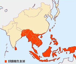 生息環境 属名をPhalaenopsis(ファレノプシス)とする胡蝶蘭は、花の形から連想したラテン語のPhalaena(蛾)とOpsis(似た)が起語とされます。しかしながら原種(野生種)や交配品種それぞれの花の形態の多くは、”蛾”とは似つかない艶やかで美しい色彩をもち、Papiliopsis(”蝶”のような)の呼び名が相応しく思われます。 胡蝶蘭原種は、インド南部、スリランカ、中国南部から台湾、インドネシア、タイ、ミャンマー、マレーシヤ、フィリピン、パプアニューギニアなど東南アジアのほぼ全域と、オーストラリア北部にまで広く分布し、その種類はPhalaenopsis属を47種(Sweet 1980)、あるいは62種(Christenson 2001、後述参照)とする分類があり、後者分類にはAphyllae亜属のbraceana, minus, haiananensisi, honghenensisなどや、Polychilos亜属のbellina, doweryensisなどが含まれます。またその国際取引は、いずれも絶滅危惧種としてワシントン条約付属書IIに含まれ、フラスコ苗あるいは実生苗であることが明らかな株を除いて、輸出国でのCITES (Convention on International Trade in Endangered Species of Wild Flora and Fauna) 許可書がなければ入手できません。