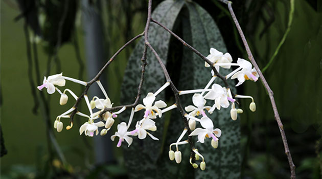 1. 花被片 花名はインドネシア・セレベス(現スラウエジ)島生息を示す。花茎は5月に現れ、7 - 8月に30輪程の花が1本の花茎の基部側から順次開花する。また晩秋から冬にかけて開花が見られる場合もある。若い株や状態の悪い場合は3 - 4輪の花を順次開花させ、同時に多輪花とならない。花の直径は3.0 ‐ 3.5cm。背ガク片(Dorsal sepal)と側ガク片(Lateral sepal)は白色。花弁(Petal)には基部から数本の、滲んだような茶色の棒状斑点が水平方向に入り、花弁が前屈み(外巻き)に咲く。背ガク片はヘラのように湾曲する。リップは多くの種が前方に伸びるのに対して、本種は下方に向かう。稀に背萼片のみ、あるいは全ての花被片が薄い黄褐色のものがある。ヘゴやコルクつけでは、花茎の基部から先端に至る開花が6ヵ月以上続くものがある。一度先端まで開花した花茎は枯れ、翌年は新たに発生した花茎に花を着ける。