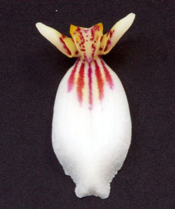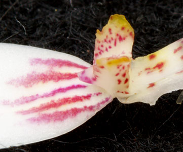 2. リップおよびカルス 下写真(左端)は手前ペタルを取り除いたもので、左右のリップ側弁は多くの種と異なり外側に向かって開いている。カルス(右写真)はamabilisと同じ1組。白色をベースに朱色の不規則な曲線や点模様が入る。カルスの先端は黄色。中央弁には基部から白色の面に朱色の縦線が5本、中心部に向かって走る。この朱色はオレンジ色や黄色の個体差がある。中央弁表面には微細な凹凸がある。中央弁先端部の外縁には細かい凹凸がある。 蕊柱の背側は薄い青紫色(左写真)で、基部には他の属には見られない大きな三角突起が左右にある。