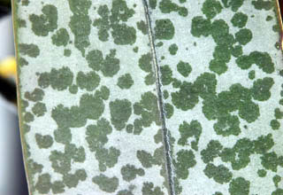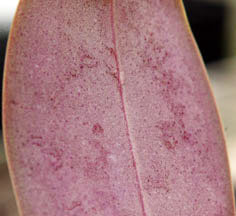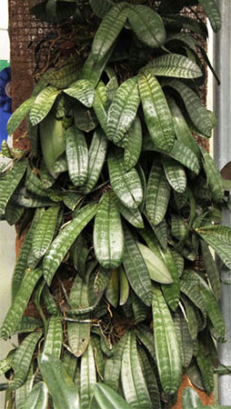3-3 葉 葉は暗緑色地に灰緑色斑が横縞状に入る。裏面は暗紫色。長さ30 - 35㎝、幅10 - 12cm。若い株は茎が垂直に伸び葉は左右に展開するためポット植えでも良く育つが、成長すると古い葉はやがて下垂するためポット植えには適さずコルク、バスケットあるいはヘゴ板がよい。大株となった本種は葉自体にも鑑賞価値がある。下写真上段は左および中央が野生株、右は実生株で、実生株はしばしば横縞状の模様の規則性が失われ暗緑色と銀緑色がランダムに混じるものが多い。現在フィリピンからの入荷株(野生種)は、ほとんどが横縞だが、台湾からの入荷株は曖昧なものが多い。 上段写真中央の野生株の若葉には葉元側に赤味がでている。これもPhal. schillerianaでは一般的な特性である。この赤味は葉の成長とともに薄れ緑色となる。下段左および中央は葉表面、右は裏面を示す。