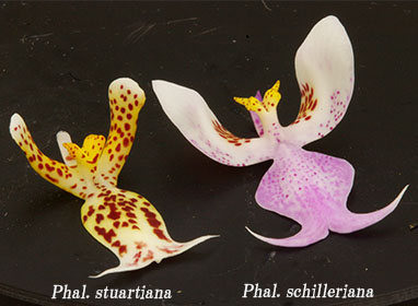 2. リップおよびカルス リップ側弁の中央から基部にかけての白地や黄斑上に、また中央弁の淡い桃紫地色の基部にそれぞれ赤色斑点が入る。中央弁の先端は錨状に二つの突起(髭)がある。カルスは1組でV字型。黄色に赤褐色の斑点をもち、左右に1つの突起がある。右写真は左がPhal. stuartiana右がPhal. schillerianaである。