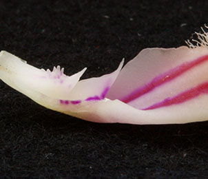 2. リップおよびカルス 右写真に見られるようにposteriorカルスは複数の小突起片を基部にもつ2分岐歯状突起からなる。この腺状突起群と、一つの突出た2分岐突起を1組とするか、それぞれを別のカルスとするかで組数は替わる。学説ではカルスは1組とされる。anteriorカルスは長く突き出た先端2分岐の歯状突起である。一方、Phal. zebrinaやPhal. corningianaのposteriorカルスは、その基部に写真に見られるような多数の腺状突起はない。また本種の中央弁先端の繊毛はPhal. corningianaに比べて密度が高い。